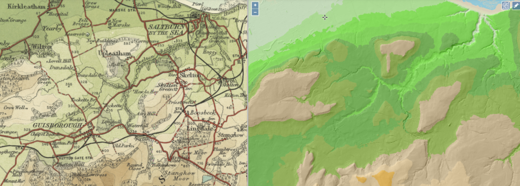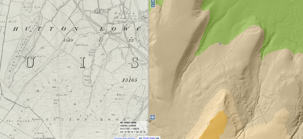 The National Library of Scotland provides maps for most of Scotland England and Wales. Using this resource provides maps for the Hutton Lowcross and Pinchinthorpe area with 5 maps showing the ordnance survey in 1853, 1893, 1913, 1927 and 1950.