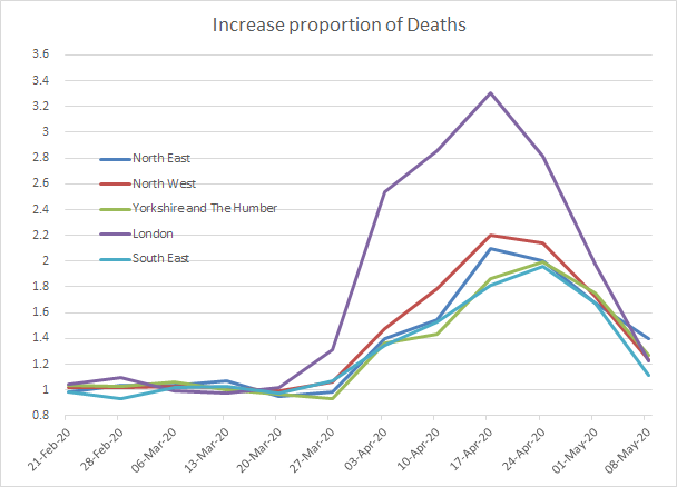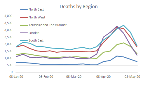 As you can see London got the worst deal, and I suspect that was because of the population density. Everywhere is now reducing, but the proportions are still high. The SE is circa 10% above the expected norm, London, North West, Yorkshire and Humber are circa 23% above the expected norm. But the North East is 40% above the expected norm. So maybe things aren’t that good, yet , in the North East!?
