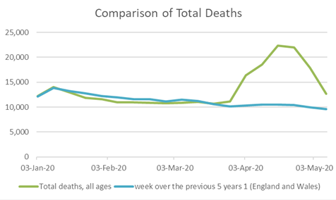 The Office for National Statistics, ONS, publish loads of data, but they are always a week or two behind. Hence the data announced daily is probably more ‘up to the minute’. This is the data from the ONS for total deaths in England and wales up to the wk of 8th May.